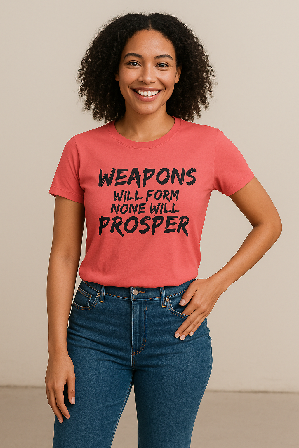 Stand tall in truth with our “Weapons Will Form, None Will Prosper” Tee — a bold declaration of faith and resilience for women and men.